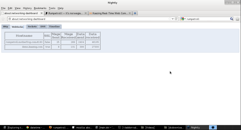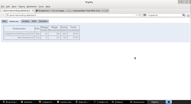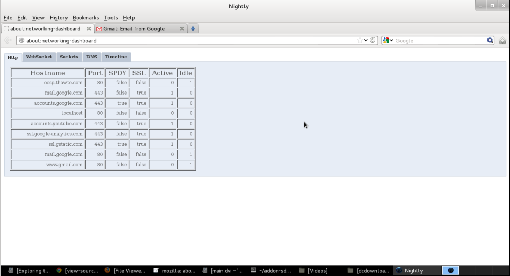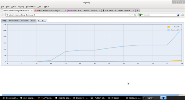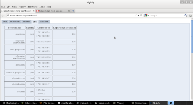 Networking Dashboard is a tool that shows internals of networking of Firefox. It's an add-on that I have made as part of GSoC project and can be used by typing 'about:networking-dashboard' in URL bar after installing this add-on. It shows current open connections with host names, how many of them are active/idle, if they are using SPDY or not, if they are using SSL or not, DNS cache entries, total data sent and received, data related to WebSocket connections etc. I have blogged about it in detail in my previous post.